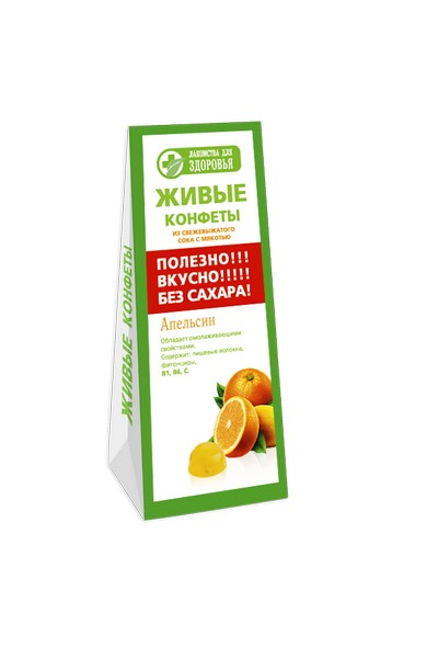 «Живые конфеты» – конфеты на основе свежих соков с мякотью фруктов. «Живые конфеты» не содержат сахара, в качестве желирующего компонента используются выжимки из морских водорослей. «Живые конфеты» насыщены полезной растительной клетчаткой, одним из главных достоинств которой является сжигание калорий во время переваривания в желудке. В каждой упаковке содержится до 40% дневной нормы клетчатки. Обладает омолаживающими свойствами. Содержит: пищевые волокна, фитонциды, В1, В6, С. Наслаждайтесь вкусом свежих фруктов круглый год
